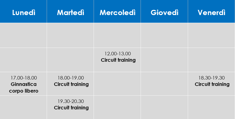 Ginnastica a corpo libero e circuit training comprendono: ginnastica generale, pre-atletismo, ginnastica specifica (stabilità del tronco, flessibilità/mobilità, schiena, piedi) e forza a corpo libero e con attrezzi vari